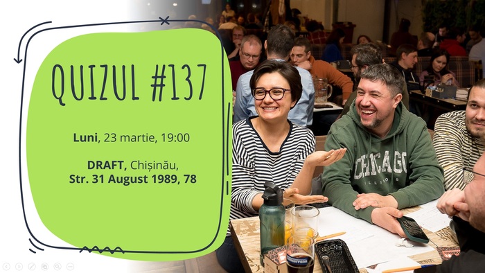 Luni, 23 martie, vă invităm la Quizul #137! Jocul va avea loc de la 19:00 la Chișinău, la DRAFT Centru (str. 31 august 1989, 78), la terasă.