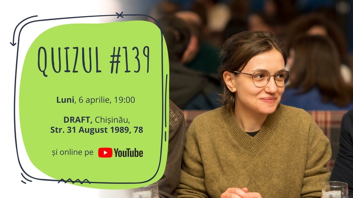 Luni, 6 aprilie, vă invităm la Quizul #139! Jocul va avea loc de la 19:00 la Chișinău, la DRAFT Centru (str. 31 august 1989, 78), și online pe YouTube.