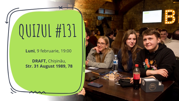 Luni, 9 februarie, vă invităm la Quizul #131! Jocul va avea loc de la 19:00 la Chișinău, la DRAFT Centru (str. 31 august 1989, 78). Vom juca în sala de jos.