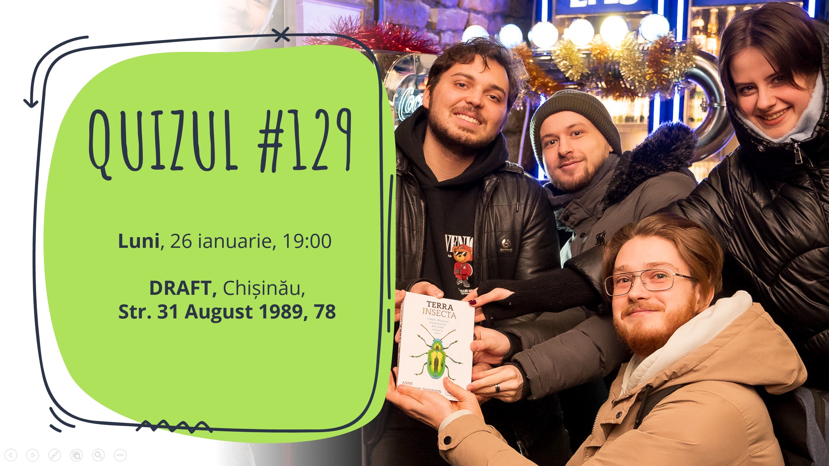 Luni, 26 ianuarie, vă invităm la Quizul #129! Jocul va avea loc de la 19:00 la Chișinău, la DRAFT Centru (str. 31 august 1989, 78). Vom juca în sala de jos, cu o capacitate mai mică - vom putea primi doar 14 echipe.