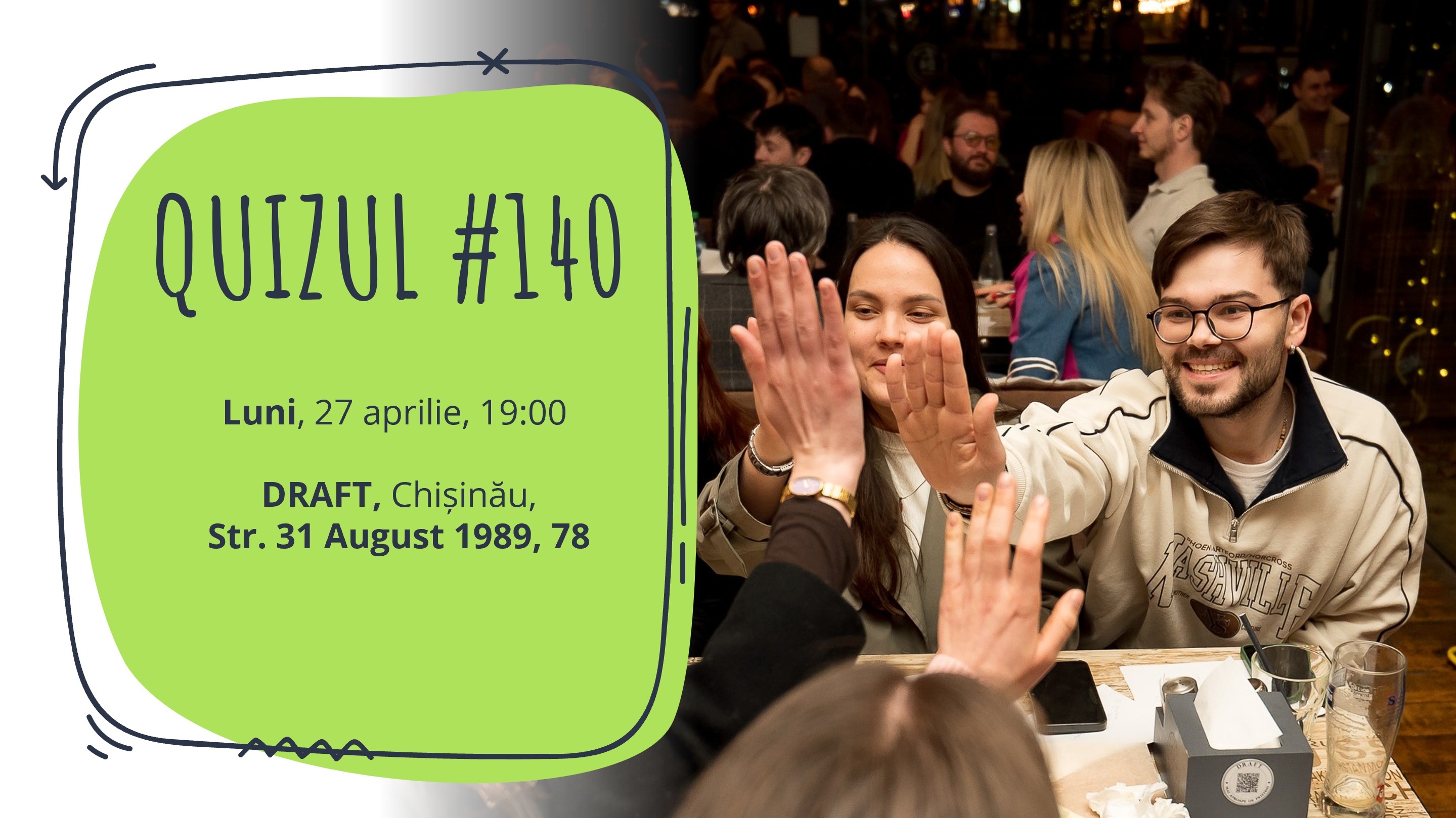 Luni, 27 aprilie, vă invităm la Quizul #140! Jocul va avea loc de la 19:00 la Chișinău, la DRAFT Centru (str. 31 august 1989, 78).